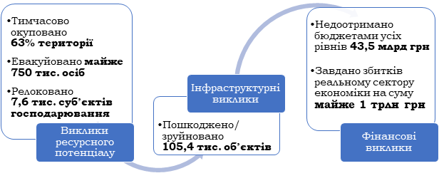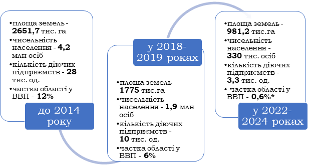 Донецька область є регіоном, який з 2014 року перебуває на передовій у боротьбі за територіальну цілісність та незалежність України. В умовах повномасштабного військового вторгнення Російської Федерації в Україну, яке розпочалося 24.02.2022, Донеччина стала однією з найбільш постраждалих областей України. При розробці Стратегії пріоритети були визначені з урахуванням результатів аналізу соціально-економічного розвитку Донецької області у 2015-2019 роках, а також при співставленні показників до та після тимчасової окупації частини території області у 2014 році. Результати даного аналізу дозволили систематизувати руйнування, економічні, демографічні, територіальні і соціальні втрати регіону та визначити основні пріоритети його подальшого розвитку. Під час розроблення змін до Стратегії його актуальність знижена, проте довгостроковий аналіз дозволяє відстежити послідовність і успадкування дій, тому його результати представлені у Додатку 1 (https://dn.gov.ua/onovlennya-strategiyi-rozvitku-doneckoyi-oblasti-na-period-do-2027-roku). На сьогоднішній день на території області відбуваються активні бойові дії, відтік працездатного населення в більш безпечні регіони та за кордон, релокація підприємств, установ, організацій, закладів, численні пошкодження та руйнування об’єктів промислового сектору та житлового фонду, втрати земельного фонду, збитки у сільському господарстві, припинення роботи провідних бюджетоутворюючих підприємств – це неповний перелік руйнівних наслідків збройної агресії Російської Федерації проти України, яких зазнала Донецька область, і які суттєво вплинули на економічну активність регіону та показники роботи. Таким чином, наразі Донецька область перебуває у дуже складних обставинах, пов’язаних з низкою нетипових викликів в умовах триваючої збройної агресії та повномасштабного військового вторгнення Російської Федерації в Україну (рис. 1.1.)