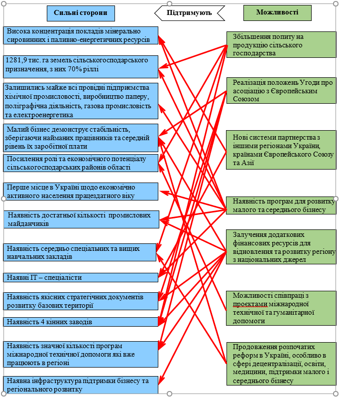 - розвитку інноваційних галузей економіки з високою доданою вартістю на засадах смарт спеціалізації, зокрема в частині сприяння розвитку провідних підприємств (сфери ‒ хімічне виробництво, біотехнології, фармація, відновлювальна енергетика та інші) та створенні нових підприємств, що орієнтуються на місцеві джерела сировини; сприянні створенню хімічного кластеру з використанням в якості сировини місцевої с/г продукції;
