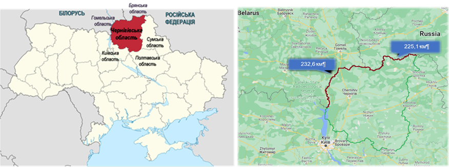 Протяжність державного кордону в межах Чернігівської області – 457,7 км (суходолом – 205,0 км та річкою – 252,7 км), з них з білоруссю – 232,6 км, з росією – 225,1 км).